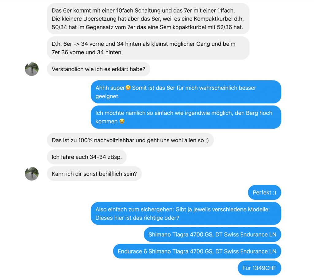 Ich werde hier eine von vielen erfolgreichen Interaktionen zwischen einem Guuru und einem potenziellen Kunden unseres Kunden schildern, die zu einem Verkauf geführt haben. Ein Guuru ist ein Markenbefürworter, der einen Markenwissenstest bestanden hat. In dieser Interaktion gab der Kunde an, dass er ein Rennrad mit möglichst kleinen Gängen sucht, und diesbezüglich Beratung braucht.