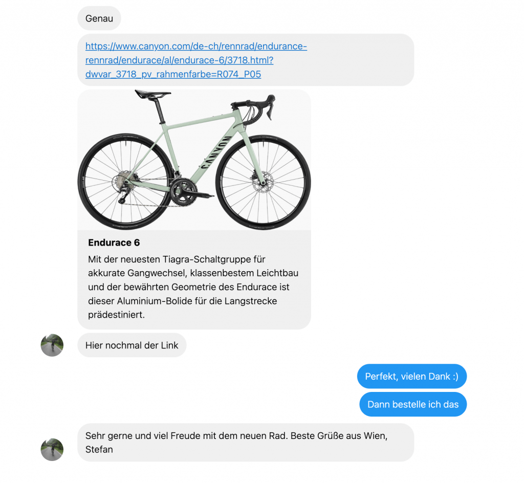 Das Gespräch wurde fortgesetzt, die Frage war sehr spezifisch, führte aber zu einem sehr zufriedenen Kunden, der genau die Informationen erhielt, die er brauchte. Stefan verknüpfte dabei seine Canyon Erfahrungen mit seinen Branchenkenntnissen.