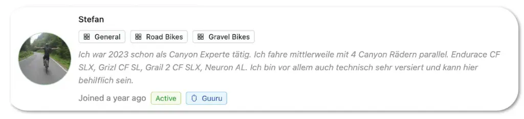 Stefan ist einer der Guurus unseres Kunden, Canyon. Er ist ein leidenschaftlicher Verfechter der Marke, der Canyon Produkte schon lange nutzt. Daher weiß er so viel über das Produkt und den Radsport. Das macht ihn zum perfekten Ansprechpartner für Kundenfragen. Stefan ist seit 12 Monaten ein Canyon Guuru.
