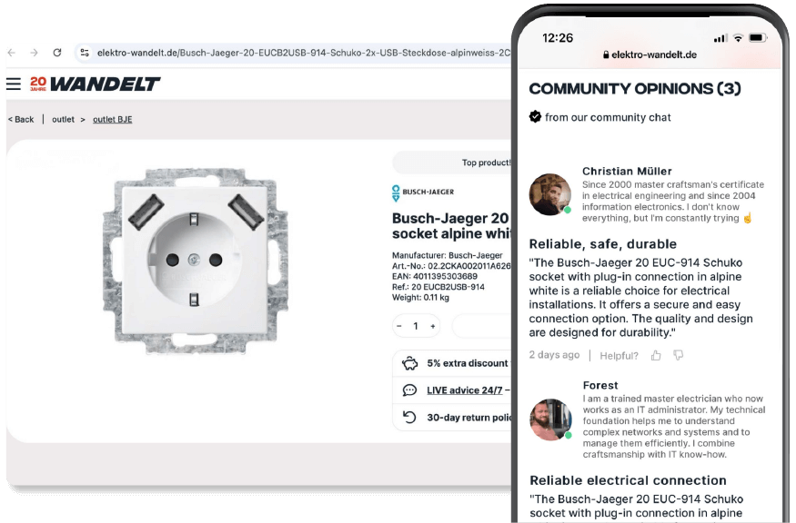 Community Content bringt vertrauenswürdige Produktmeinungen aus echten Kundengesprächen nahtlos auf deine Produktseiten. Unterstützt durch AI erkennt es täglich wertvolle Inhalte und hält deine Seiten relevant und ansprechend.