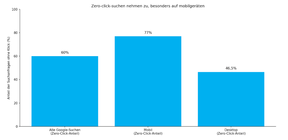 Aktuelle Daten zeigen, dass bereits etwa 60 % der Google-Suchen ohne Klick auf eine externe Website enden. Mobile Suchen treiben diese Entwicklung: Auf Smartphones enden 77 % der Anfragen ohne Besuch einer anderen Webseite, im Vergleich zu 46,5 % am Desktop.