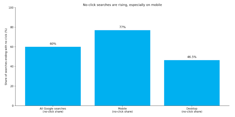 Recent data shows that already about 60% of Google searches end without any click to an external website. Mobile searches are driving this transformation: on phones, 77% of queries end without visiting another website, compared to 46.5% on desktop.